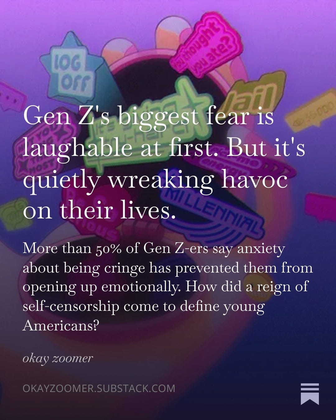 “More than half of adult Gen Z respondents said that they have avoided expressing themselves freely online for fear of coming across as cringe,”— kelsey weekman via okay zoomer