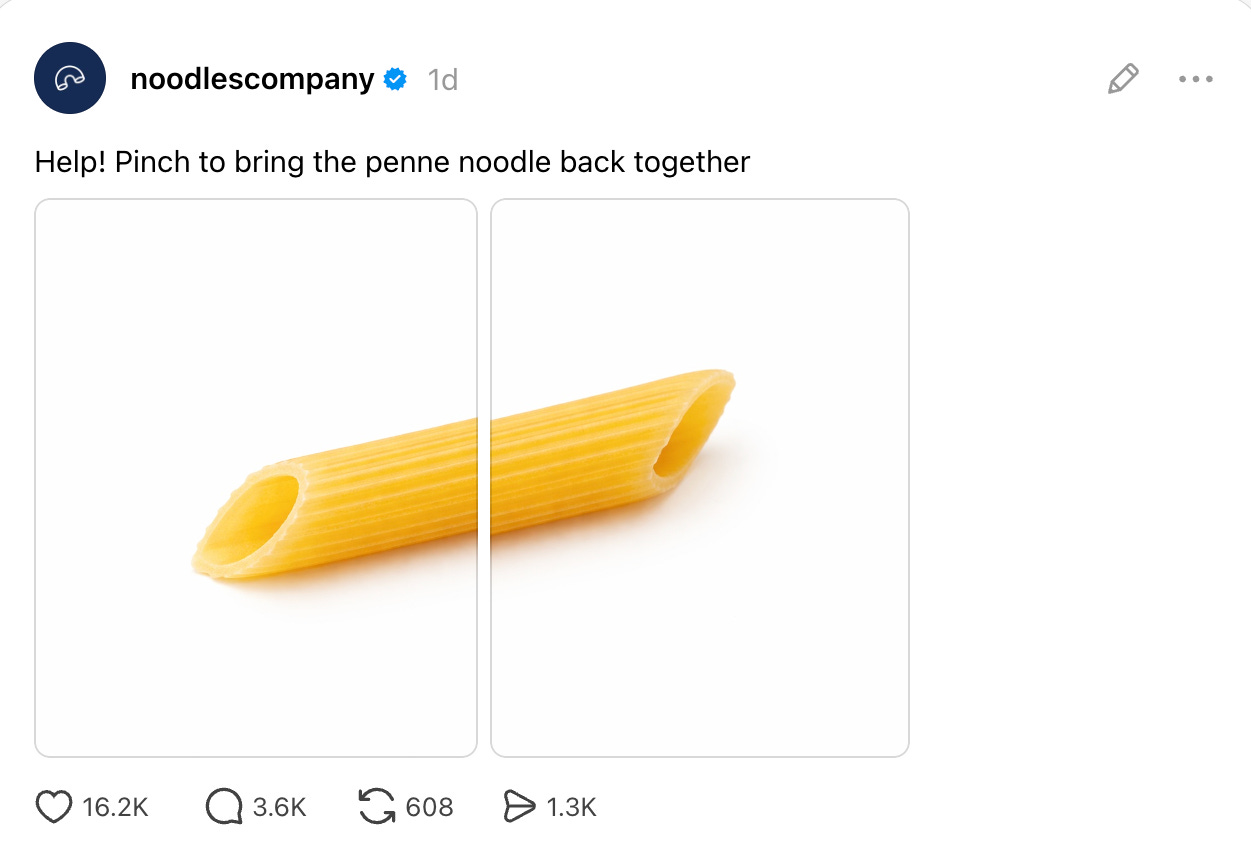 On Threads, brands are posting two separate images with “pinch to make it big,” playing into a glitch that merges them into one. Noodles Company joined in but the images didn’t line up, exposing a visible seam that sparked a second wave of reactions.