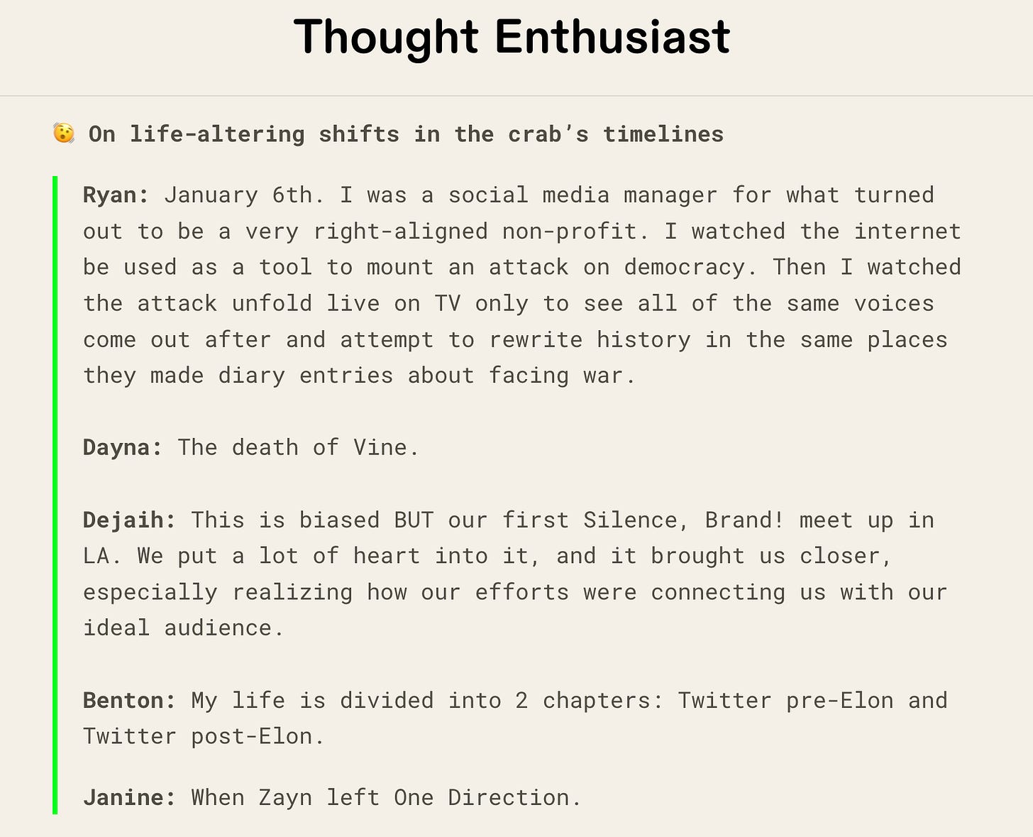 Our friends at Thought Enthusiast thought it would be a good idea to ask us what we’re vibing with on the internet right now and keeps our crabby claws clicking.