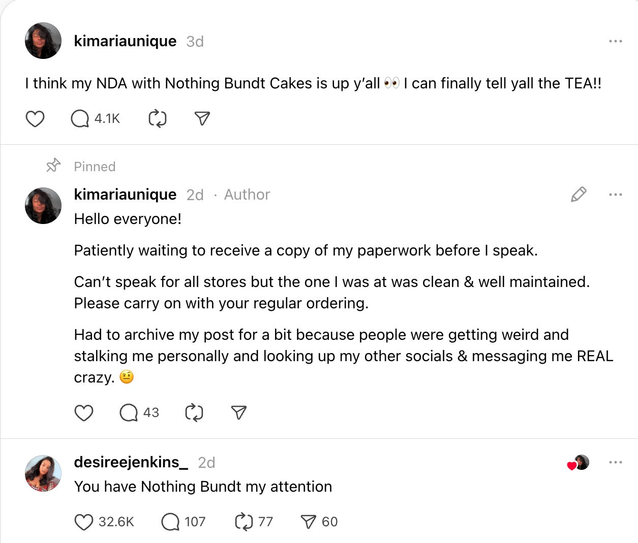 A Threads user went viral after posting that they were leaving Nothing Bundt Cakes and their NDA was about to expire, then refusing to elaborate, sending the comments into a frenzy waiting for drama. Instead of a scandal, the replies filled with speculation and jokes, with many users guessing the big “secret” was simply that the cake mix comes from Sysco. The anticlimax became the joke itself, turning the post into a mini internet mystery with a very boring punchline.